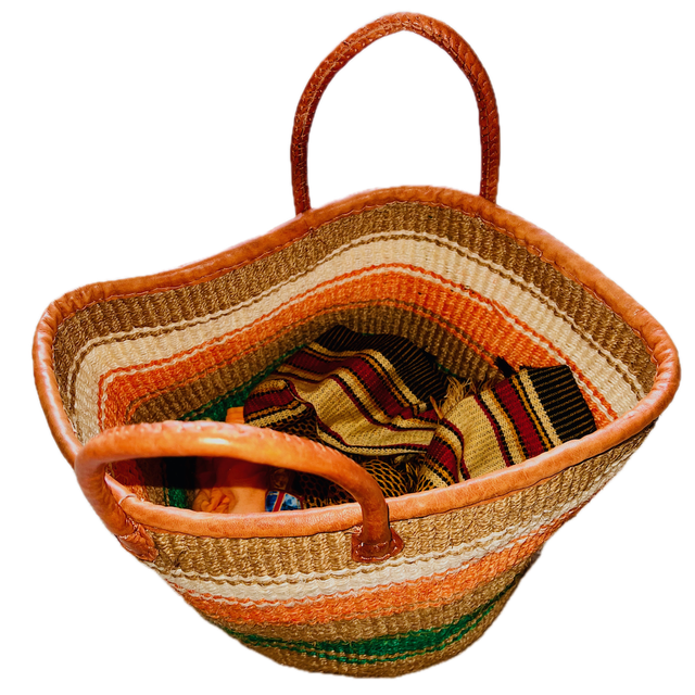 Hand-woven Shopping Bag (Large). Hand-made from woven sisal with leather edging and handles. Diameter of bag at top and bottom is approx 38cm. Bag height is approx 36cm. Bag height including handles is approx 51cm. Bottom of bag image is to show the style, though if the bag has a colour near the bottom, the bottom will also be in that same colour. Imported from Kenya.