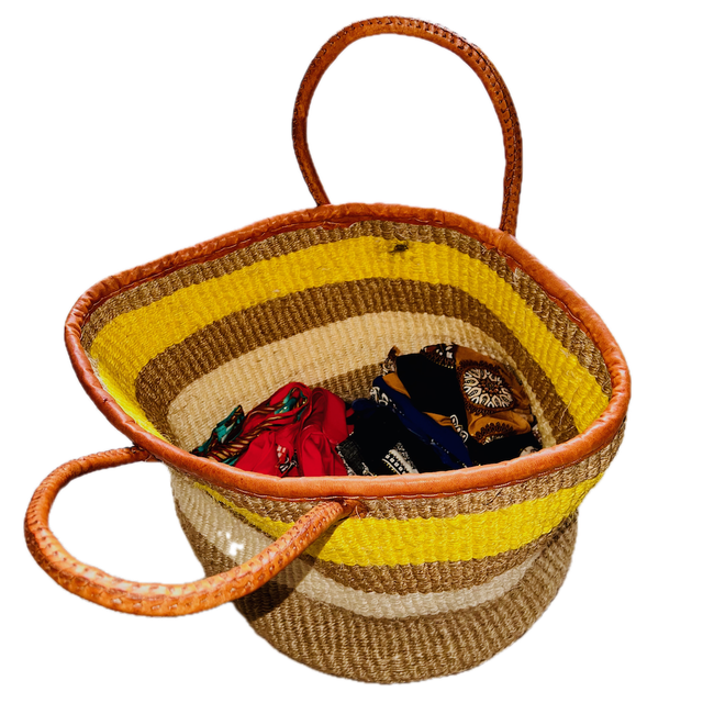 Hand-woven Shopping Bag (Large). Hand-made from woven sisal with leather edging and handles. Diameter of bag at top and bottom is approx 38cm. Bag height is approx 36cm. Bag height including handles is approx 51cm. Bottom of bag image is to show the style, though if the bag has a colour near the bottom, the bottom will also be in that same colour. Imported from Kenya.