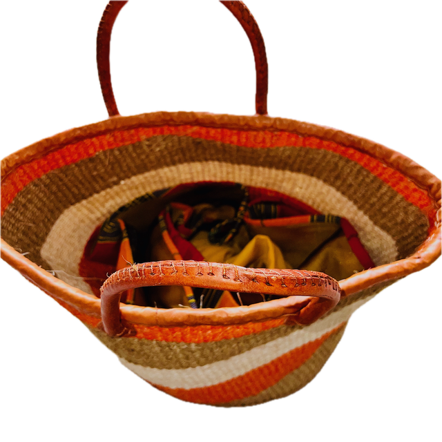 Hand-woven Shopping Bag (Large). Hand-made from woven sisal with leather edging and handles. Diameter of bag at top and bottom is approx 38cm. Bag height is approx 36cm. Bag height including handles is approx 51cm. Bottom of bag image is to show the style, though if the bag has a colour near the bottom, the bottom will also be in that same colour. Imported from Kenya.