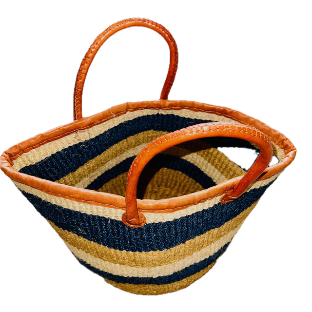 Hand-woven Shopping Bag (Medium). Hand-made from woven sisal with leather edging and handles. Diameter of bag at top and bottom is approx 35cm. Bag height is approx 31cm. Bag height including handles is approx 44cm. Bottom of bag image is to show the style, though if the bag has a colour near the bottom, the bottom will also be in that same colour. Imported from Kenya.