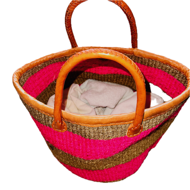 Hand-woven Shopping Bag (Medium). Hand-made from woven sisal with leather edging and handles. Diameter of bag at top and bottom is approx 35cm. Bag height is approx 31cm. Bag height including handles is approx 44cm. Bottom of bag image is to show the style, though if the bag has a colour near the bottom, the bottom will also be in that same colour. Imported from Kenya.