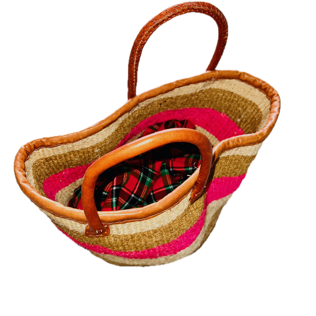 Hand-woven Shopping Bag (Medium). Hand-made from woven sisal with leather edging and handles. Diameter of bag at top and bottom is approx 35cm. Bag height is approx 31cm. Bag height including handles is approx 44cm. Bottom of bag image is to show the style, though if the bag has a colour near the bottom, the bottom will also be in that same colour. Imported from Kenya.