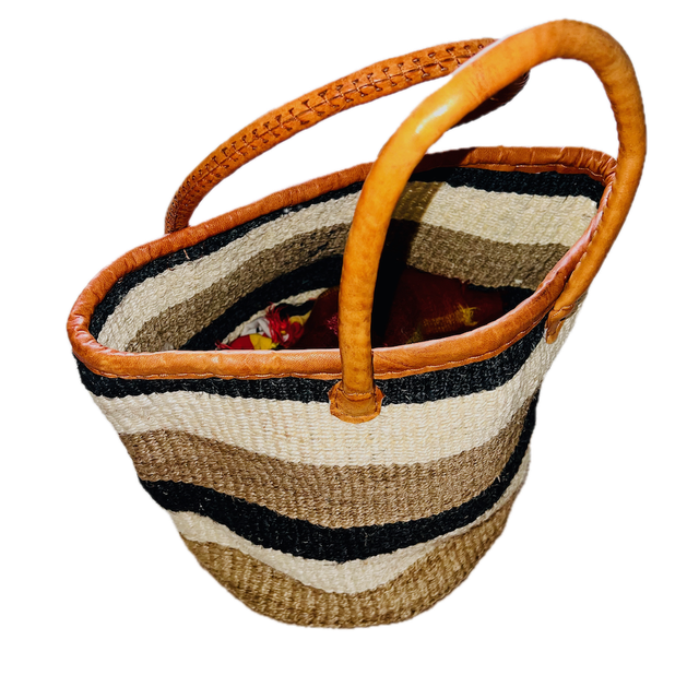 Hand-woven Shopping Bag (Small). Hand-made from woven sisal with leather edging and handles. Diameter of bag at top and bottom is approx 28cm. Bag height is approx 28cm. Bag height including handles is approx 41cm. Bottom of bag image is to show the style, though if the bag has a colour near the bottom, the bottom will also be in that same colour. Imported from Kenya.