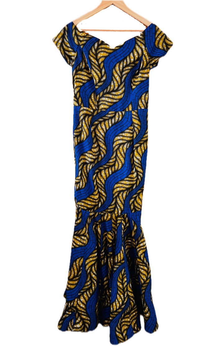 Printed blue Ghanaian evening dress. 100% Cotton.