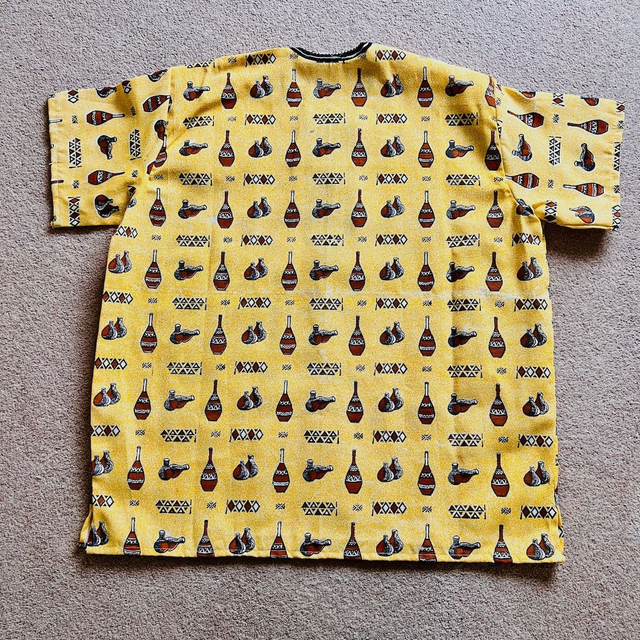 Hand made African Shirt, yellow with brown bottles design. 100% Cotton.
