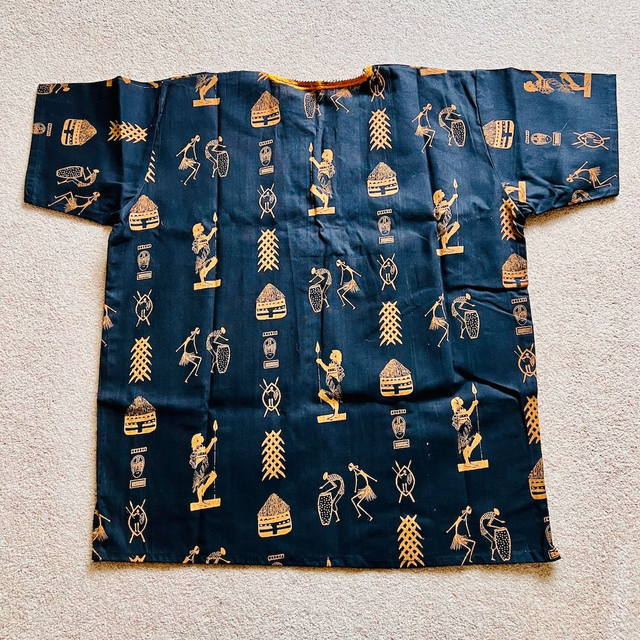 Hand made African Shirt. Black with golden African symbols design. 100% Cotton.