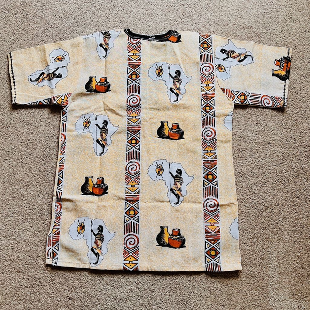 Hand made African Shirt. Yellow with African images design. 100% Cotton.